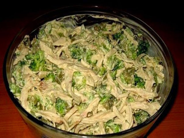 Остывшую курицу разделить на волокна, брокколи порезать не слишком мелко. Огурцы мелко нарезать. Все вместе соединить и заправить майонезом. Украсить зеленью.